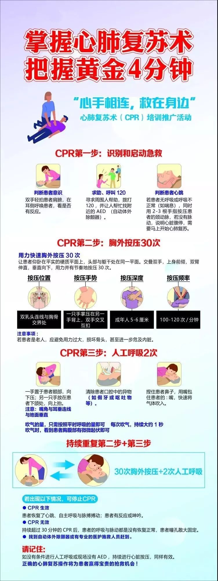 据了解,我国成人心肺复苏普及率不到1%。心搏骤停一旦发生,如得不到及时抢救复苏,4~6分钟后会造成患者脑和其他人体重要器官组织不可逆的损害,因此,心搏骤停后的心肺复苏(CPR)必须在现场立即进行,而让更多的人了解并掌握心肺复苏技能在遇到急突发情况下非常重要。